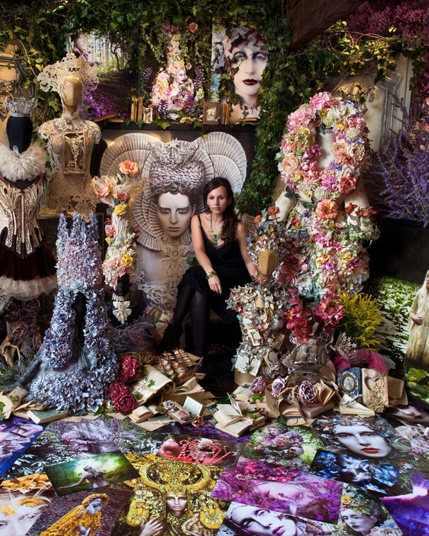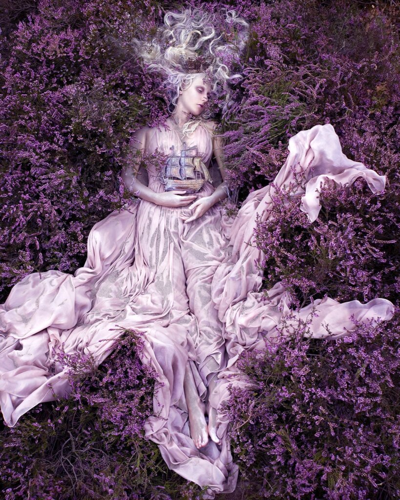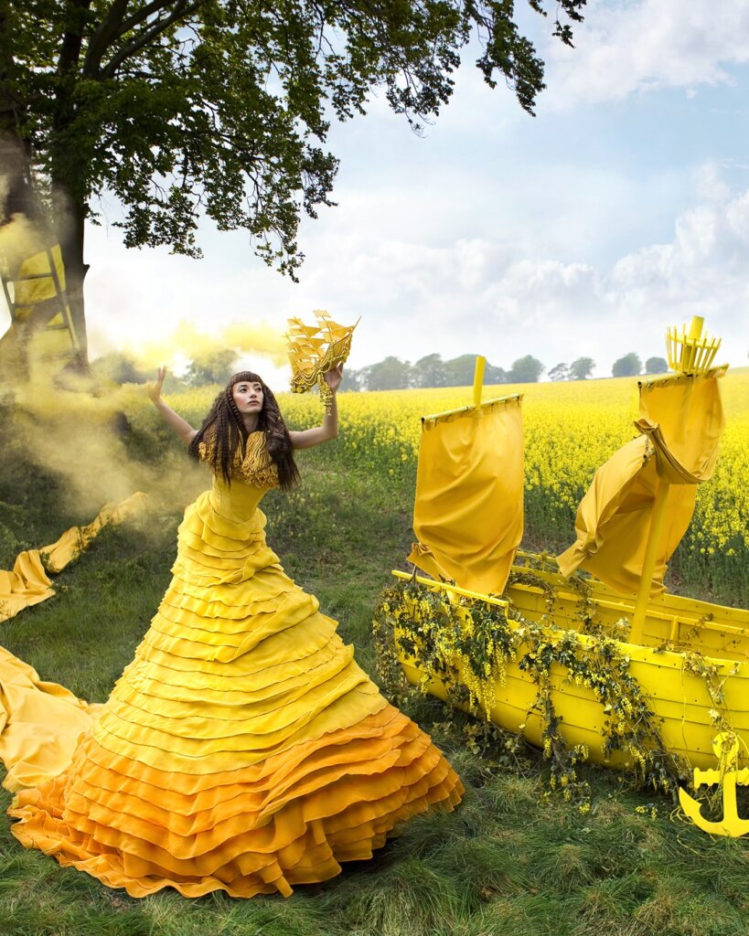 Kirsty Mitchell har en bakgrund inom modedesign och kostymskapande, något hon förstås bär med sig när hon skapar sina storslagna och samtidigt otroligt detaljrika konstverk. För multikonstnären Mitchell gör de spektakulära kostymerna och all rekvisita själv och för hand – och det kan ta månader att få färdigt allt material till en scen.